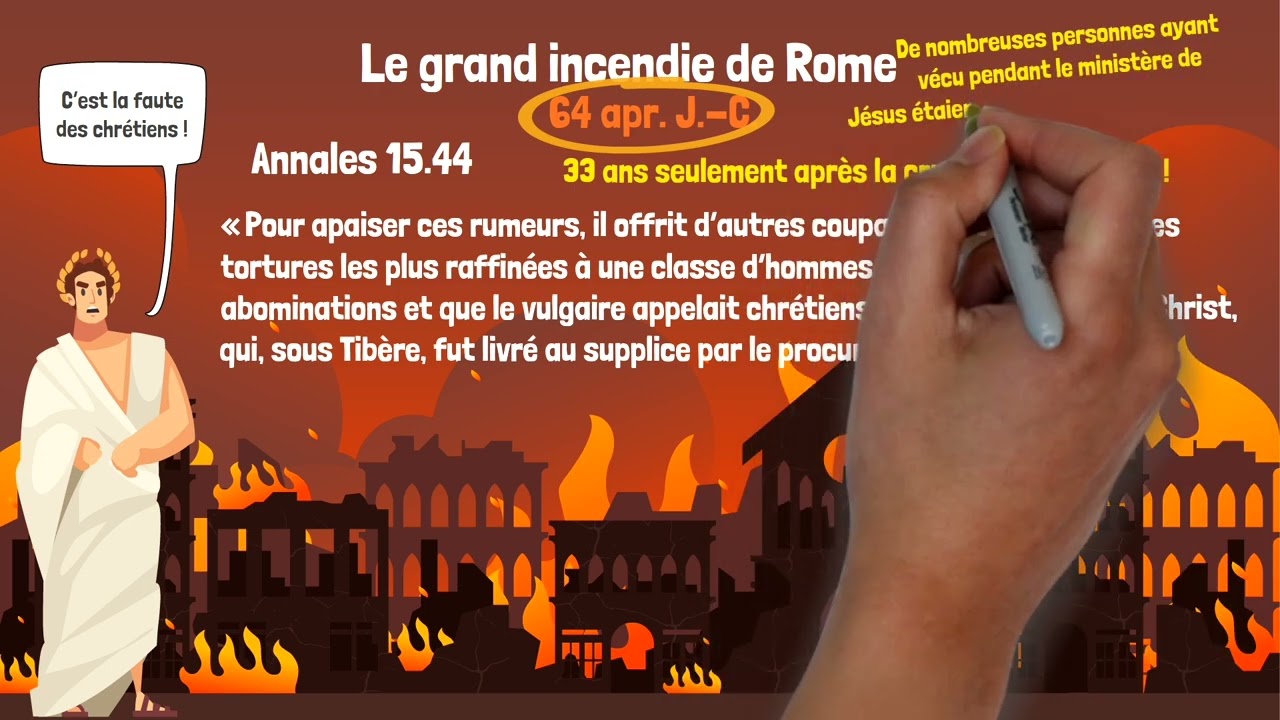 C’est dans cet ouvrage que nous trouvons l’un des premiers récits historiques de Jésus. Dans le livre 15, Tacite raconte le grand incendie de Rome, qui eut lieu en 64 apr. J.-C. À l’époque, beaucoup croyaient que c’était Néron lui-même qui ordonna le déclenchement de l’incendie. Mais pour tenter de rejeter la faute sur autrui, Néron accusa un nouveau mouvement religieux d’être à l’origine de la destruction. Tacite explique :